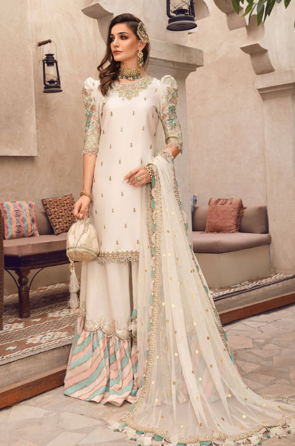 Embroidered cotton satin front, dupatta lace with organza neckline. Embroidered organza ghera and chaak lace. Organza jacquard ghrara patti with dyed cotton satin gharara fabric. Gracefully showing plain cotton satin back.