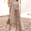 Modish embroidered dress is ensemble with lawn and organza. Attractive embroidery on lawn center and side panel as well as sleeves. Embordered organza neck and overall ghera patches with embroidered organza sleeves patti. Dyed lawn back with dyed cambric trouser. Burnout poly organza dupatta with graceful embroidered organza dupatta center patches and dupatta panel patti. Stunning look of puff printed net dupatta and embroidered organza dupatta patti.