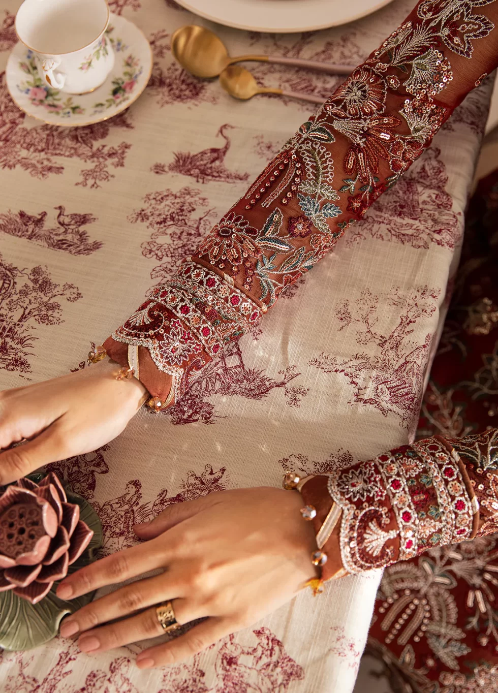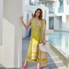 Embroidered & sequined chiffon center panel for front, left-side & right-side panels, sleeves and border for sleeves, back, dupatta, dupatta pallu extension and raw slik border of dupatta, border front & back, with graceful adda-worked, embroidered & sequined organza neckline for front. Dyed inner shirt lining with dyed raw silk trouser.