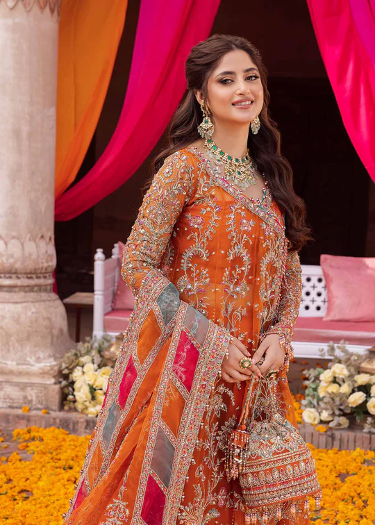 Embroidered organza fabric orange color ”Mina” is stunning masterpiece with hand embellished front, back panels and borders. Embroidered front patti, sleeves and trouser borders. Shirt inner included. Dyed trouser and four side lace dupatta showing its grace.