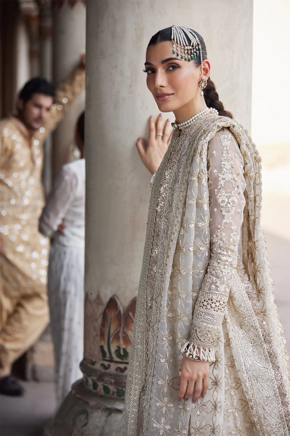 Noori made by organza embroidered front left and right panels, borders, back, back neck line. Embroidered sleeves and sleeves border. Embroidered shoulder front, back patch. Dupatta is also looking graceful with embroidery. Trouser is dyed in raw silk.