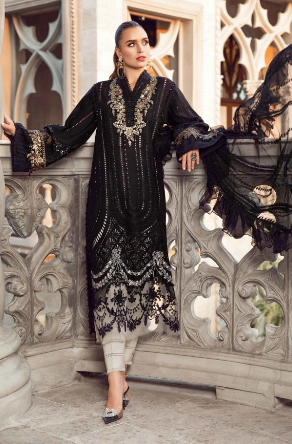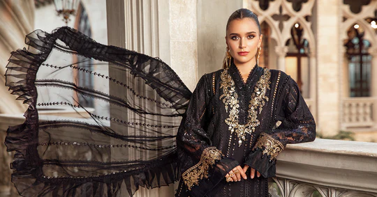 Embroidered lawn neck patch and patti with pearls. Embroidered 3D flowers giving graceful look. Embroidered lawn front center patch, center panel and side panels. Embroidered organza ghera patch. Embroidered lawn sleeves with organza sleeves patch. ‘’Shaam-E-Ulfat’’ have dyed lawn back with dyed cambric trousers and stunning embroidered net dupatta along with organza dupatta patti.